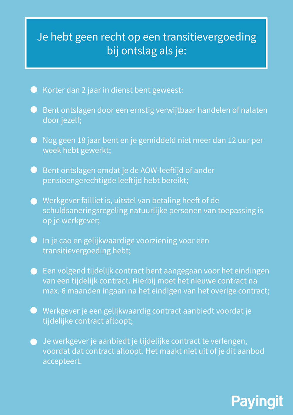 Hieronder vind je een overzicht van scenario’s waarbij een transitievergoeding niet geldt. De informatie op het overzicht is afkomstig van de website van de Rijksoverheid.